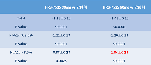 在基线HbA1c>8.5%的亚组中,相较安慰剂,HRS-7535降糖效果更显著,达1.84%(表1):