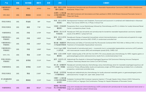 在消化系统肿瘤领域,永利皇宫官网产品相关研究共入选2项口头报告、11项壁报和1项电子壁报,共14项研究。除卡瑞利珠单抗和阿帕替尼外,还有4篇阿得贝利单抗治疗消化系统肿瘤研究入选。HRS-4642、瑞拉芙普-α注射液(SHR-1701)等在研创新产品也有相应研究亮相。另有1项伊立替康脂质体(II)用于胰腺癌治疗的研究入选壁报。