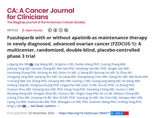 2025年11月25日,永利皇宫官网医药自主研发的创新药氟唑帕利联合阿帕替尼或氟唑帕利单药用于新诊断晚期卵巢癌(OC)的一线维持治疗研究最新数据(FZOCUS-1研究)重磅在线发表于国际顶尖医学期刊《临床医师癌症杂志》(A Cancer Journal for Clinicians,简称CA,2024年影响因子高达232.4)1。